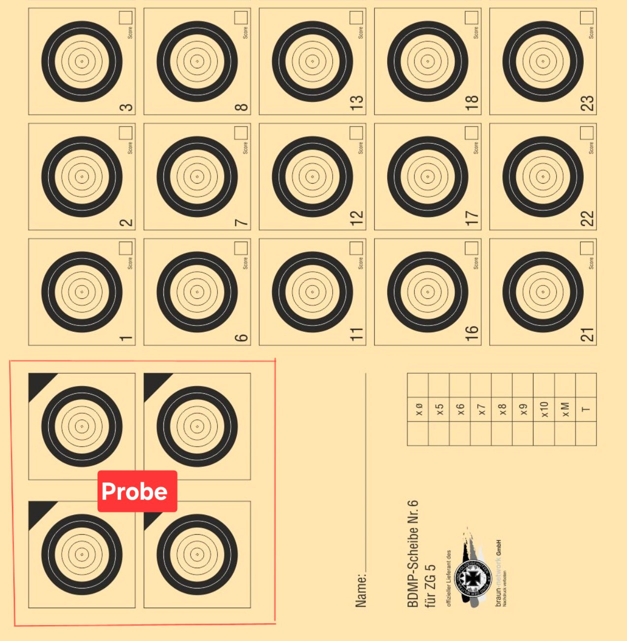 (Es sind 4 Schuss Probe zulässig, die binnen 2min geschossen werden müssen. Dabei ist ein vor holen der Scheibe nur nach Beendigung der Serie zulässig.)